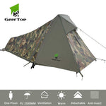 Brand Name:GeerTop Layers:Single Building Type:Construction Based on Need Type:1 - 2 Person Tent Pole Material:Aluminum Bottom Waterproof Index:2000-3000 mm Structure:One Bedroom Area:75 x 225 cm Outside Tent Waterproof Index:2000-3000 mm...