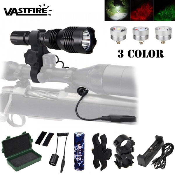 Model Number: 3 Colors Hunting Flashlight Brand Name: VASTFIRE Item: Tactical Hunting Flashlight Material: 6061T Aluminum Bulb: L2 White/T6 Green/XPE RED Operate Voltage: 3.7V Light Color: White/Green/Red Switch Type: Remote...