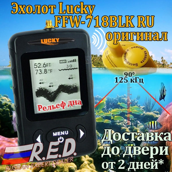 Sonar Frequency: Wireless: 125Khz Power Source: No. 7 Battery Power Input: AAA Sonar Coverage: 90 degrees beam angle Detecting Range: 0.6-36 Meter Brand Name: LUCKY Language: RUS/ENG Type: Professional Dot...